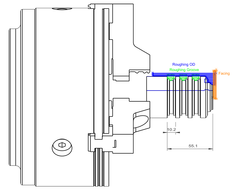 Questo si traduce nella seguente immagine per GO2cam Filetto destro all'esterno con utensile sinistro