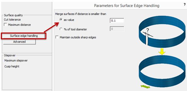 サーフェスのエッジ処理は、ギャップ、オーバーラップ、予期しない動作などの一般的な問題を防ぎ、スムーズで正確な加工プロセスを保証します。サーフェスのマージは、エッジの精度に関する問題に対処する効果的な方法です。マージ距離を固定値または工具直径のパーセンテージとして設定できます。 サーフェスのエッジ処理を効果的に管理することで、次のようなことができます。