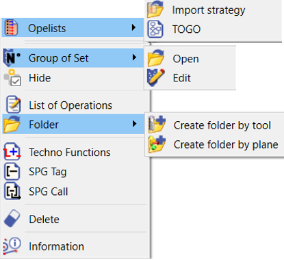 これらの機能にアクセスするには、 右クリック 加工ツリーの 加工 行で: