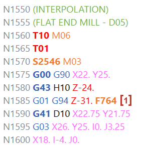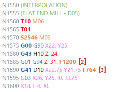 The tool plunges with the value 1200 [2] then start working by modifying the feedrate back to the standard value [3] . |