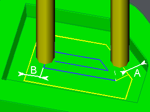 XY向素材預留量 (A)在加工輪廓上定義的預留量。 XY精修預留 (B): 在掃掠路徑(藍色)和自動輪廓再加工(黃色)之間的預留量。 |