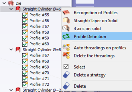 模具和沖頭被識別,以及所有其他形狀,如圓柱體、恆定和漸進錐度、4 軸形狀。 建立一個樹來可視化和分析形狀,它還提供一些指令,例如在輪廓上的自動穿線。 您可以從樹中停用/啟動輪廓,以隱藏或在螢幕上顯示它們。 |